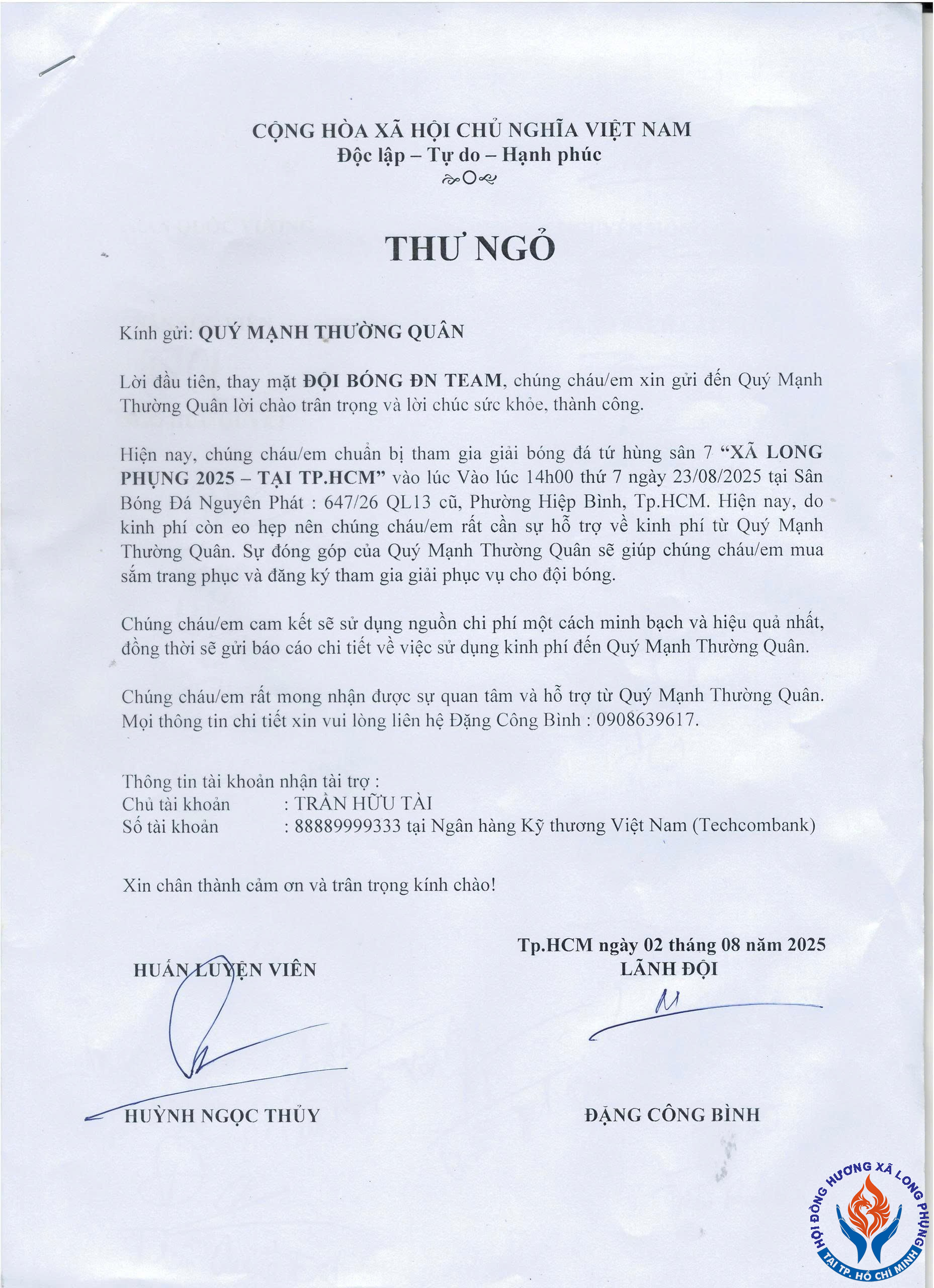 Sự góp mặt và ủng hộ của mỗi người sẽ là nguồn động viên to lớn, giúp đội bóng thêm vững tin và Hội Đồng Hương Long Phụng ngày càng gắn bó, phát triển.