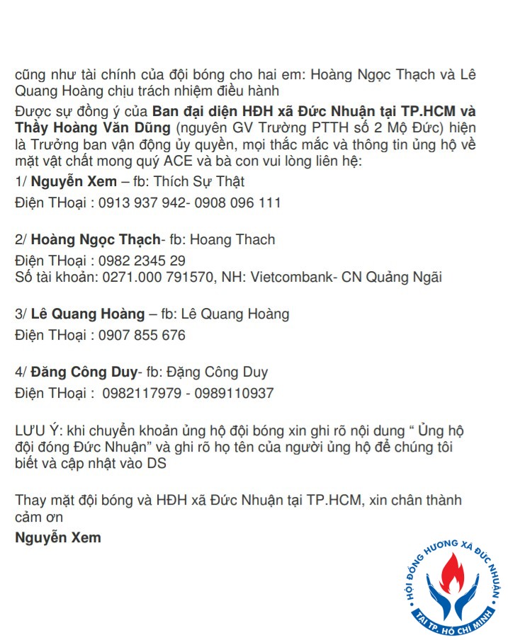 Được sự đồng ý của Ban đại diện HĐH xã Đức Nhuận tại TP.HCM và Thầy Hoàng Văn Dũng (nguyên GV Trường PTTH số 2 Mộ Đức) hiện là Trưởng ban vận động ủy quyền, mọi thắc mắc và thông tin ủng hộ về mặt vật chất mong quý ACE và bà con vui lòng liên hệ: