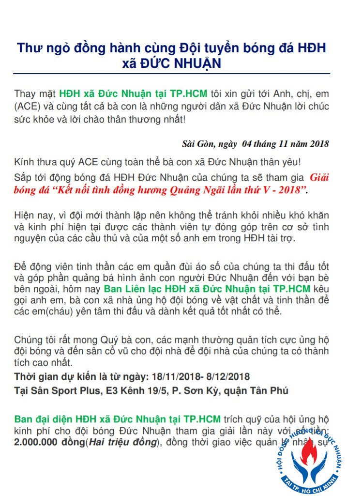 THƯ KÊU GỌI TÀI TRỢ KINH PHÍ CHO ĐỘI BÓNG HĐH ĐỨC NHUẬN